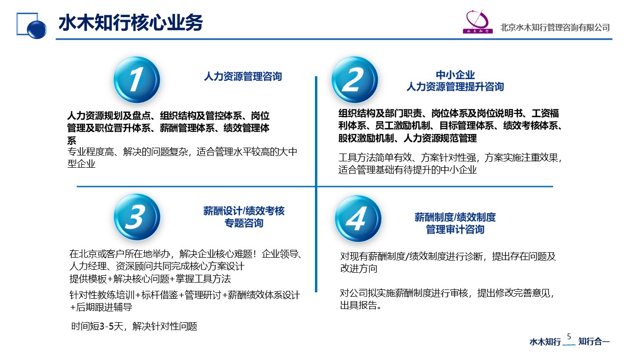 北京水木知行管理咨詢有限公司(www.bjsmzx_com.blxnjy.cn)專注提供人力資源管理咨詢、人力資源管理培訓(xùn)、人力資源招聘咨詢、人力資源獵頭服務(wù)業(yè)務(wù);咨詢業(yè)務(wù)范圍包括組織結(jié)構(gòu)與管控體系、崗位管理體系、薪酬管理體系、績效管理體系,咨詢形式包括全過程咨詢、教練式咨詢和特訓(xùn)班;培訓(xùn)業(yè)務(wù)包括企業(yè)基礎(chǔ)管理...[詳情]